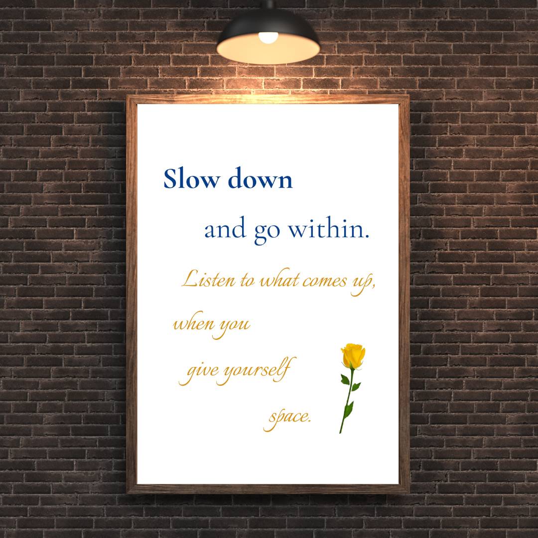 Slow down and go within. Listen to what comes up, when you give yourself space. Quote taken from "She'll Do It Her Way" by Andrea Goodridge.